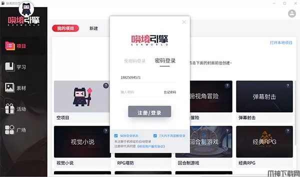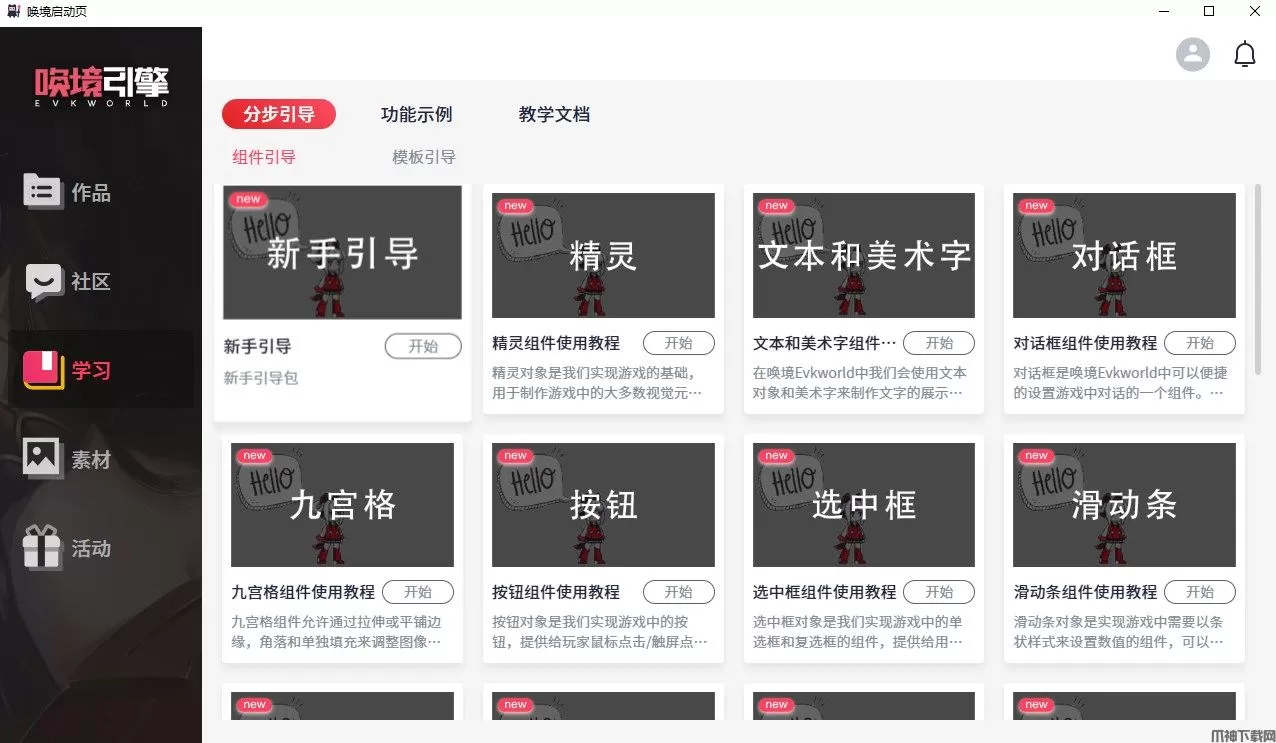 唤境Evkworld电脑版是一款无需会编程就能使用的全能2D游戏编辑器。唤境引擎为新手用户提供了数个游戏模板,用户可在唤境引擎开始页找到对应的游戏模板。游戏模板可以让玩家不需要编写事件也可以实现模板提供的游戏功能,只需要按照模板的规则,调整变量、坐标等数据即可。操作简单,初学者也可以轻松驾驭,图形化操作界面,简单易懂好上手。还内置了智能游戏逻辑事件表,无需编写复杂繁琐的代码,通过简单的触发条件与执行动作互相组合,即可轻松实现复杂游戏逻辑!丰富内置组件,拒绝重复工作,全部不用重复开发,只需进行简单设置,即可马上使用,大大减少重复性的工作和缩短了游戏作品的制作时间。欢迎下载体验!