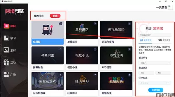 点击新建项目,即可创建新的空白项目。你可以设置项目的游戏类型和分辨率大小。在分辨率这里,我们事先预设了一些常用设备的分辨率,当然您也可以自己随意设置。