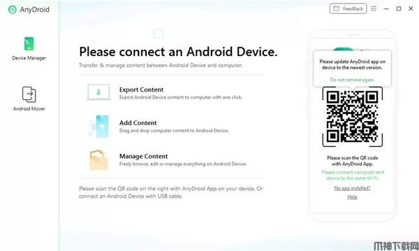 1、在电脑上安装并启动AnyDroid。通过USB电缆将您的Android设备连接到电脑。你可以在你的安卓手机上下载AnyDroid无需USB电缆,通过Wi-Fi将手机连接到电脑。