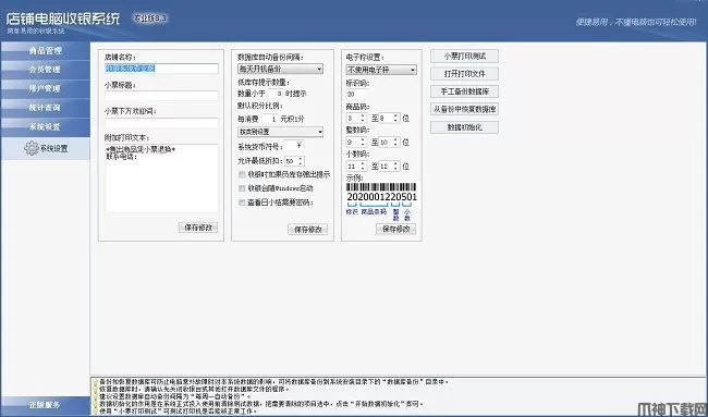 主要就是用来设置便利店收银系统的,在这里可以自定义打印票据中的店铺名称、小票标题和欢迎词。同时可以设置是否每天开机都自动备份,这可以防止因为误操作而导致数据丢失的情况。同时还可以设置库存小于多少自动提醒,积分比例的设置,多少元可以兑换多少积分。