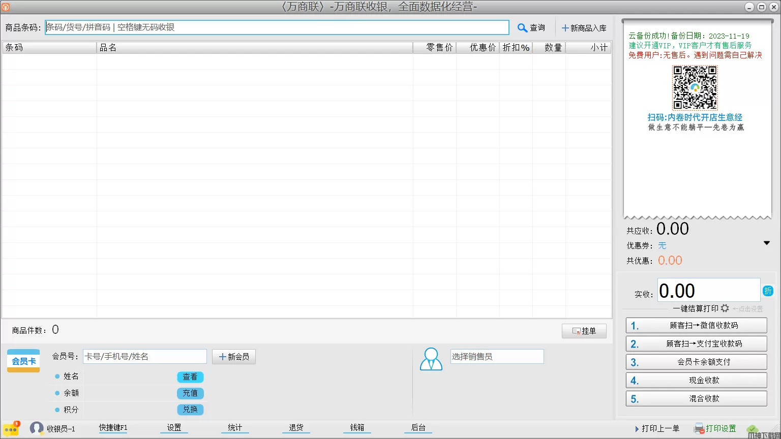 主要集中在收银上,用户在进行商品扫描的时候,界面就会自动显示出商品的条码、商品名、单价、会员价、折扣?数量和金额等信息,并难呢过自动进行价格的运算,实收、找零等信息在这里都会一一实现,并可自动打印票据