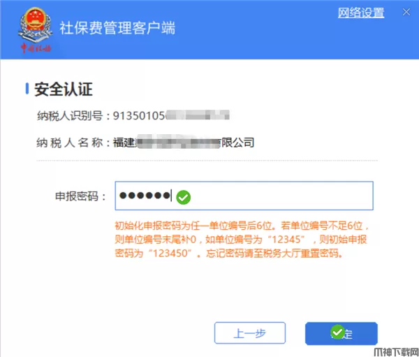 对于初次使用客户端的用户,系统进行安全认证,要求输入密码验证。初始密码为单位已参加的任意险种单位编号后6位。此单位编号为医社保经办机构提供,用户如忘记可向医社保经办机构咨询或登录电子税务局查询。