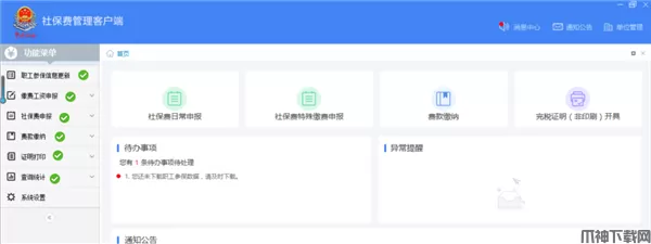 标准版客户端提供职工参保信息更新、缴费工资申报、社保费申报、费款缴纳、证明打印、查询统计等六大业务模块,下面我们按照企业申报缴费流程进行演示。