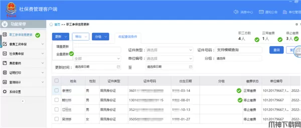 用户依次点击“职工参保信息更新-更新”,用户可以根据自身需求选择“全量更新”或“增量更新”,一般首次使用选择“全量更新”。系统将从税务局端更新下载职工参保信息。客户端将展示所有参保过职工信息,职工分为职工总数,正常缴费,停止缴费等。用户需认真核对,部分职工单位编号有多个,代表其参加了职工养老、工伤、失业、机关养老等不同险种,可通过查看按钮点击查看具体信息。目前福建省(不含厦门)医疗保险为征集模式,即由医保经办机构传送征集数据给税务局进行扣款,因此不展示用人单位参加医疗保险的职工明细。