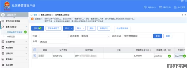 “日常缴费工资申报”自动带出当前有效职工,用户输入新缴费工资,生效月份,核对无误后提交申报。注意职工缴费工资申报一旦提交,将即时(以后每个月初)触发生成其生效月份起的预处理数据,只能调整缴费工资,无法删除,直至减员,因此用人单位经办对已离职人员必须及时到社会保险经办机构办理减员手续,不得跨月。跨月减员造成系统自动生成含离职人员的应申报预处理信息,必须由税务前台核销预处理信息,方可确认申报,以免造成多缴退费。