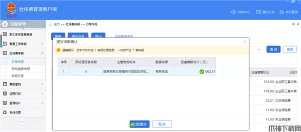 缴费工资申报首次成功后系统自动生成预处理数据,且系统会在每个月月初或缴费工资变动时触发预处理数据重新生成。用户点击“社保费-日常申报”模块,勾选已生成的预处理信息进行确认申报,可分属期分险种勾选。如用户已参加医疗保险,医保部门已传送征集数据,用人单位也可在该模块进行确认申报。