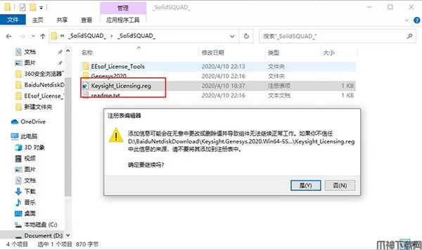 11、运行“Keysight\u Licensing.reg”并确认将信息添加到Windows注册表