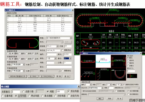 3、 钢筋图软件包(钢筋绘制、标注、自动生成钢筋表材料表,图、表可关联修改)。