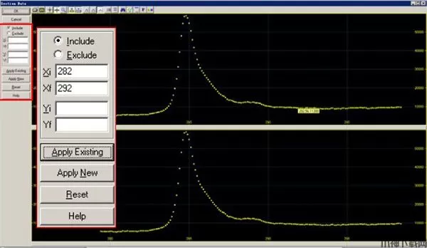 2、在左侧界面中输入适当的“Xi”和“Xf"值,尽量让谱峰位于图中正中位置,点击“ApplyExisting” ;