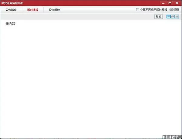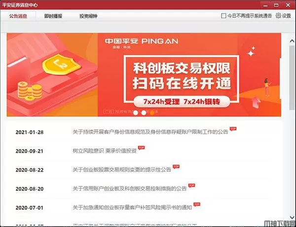 1、安装完成后,会自动进入平安证券慧赢软件的主界面,并弹出平安证券消息中心。平安证券消息中心分为三大块,分别是公告消息、即时播报和投资闹钟。