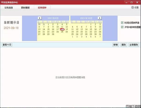 4、在投资闹钟页面可以新增提示闹钟,当用户需要关注某条证券时,可以通过这种方式进行提醒,还可以按日期进行查找历史提示。