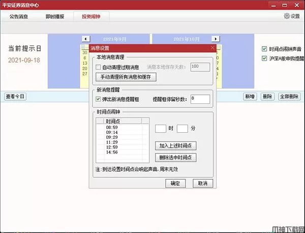 5、点开投资闹钟页面右上角的设置还可以进行本地消息的清理,以及增删时间点的功能。有需要的用户可以在此进行相关设置。