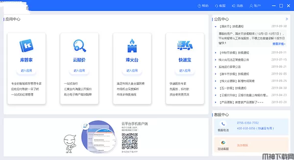 华强云平台电脑版是一款全能的管理软件,它可以帮助大众商户解决99%的经营烦恼。首先软件为企业内部信息化管理及商业化数据服务应用提供整体解决方案以此来帮助用户更好的去使用它。其次软件功能丰富,为用户提供了快递宝、烽火台、CRM、云报价、库管家、云商城、收支宝、进销存等功能,更加高效率的管理自己的店铺。