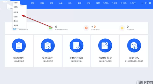 11、如图所示,这里就是库管家的功能界面,可以在软件管理门店的进销存业务