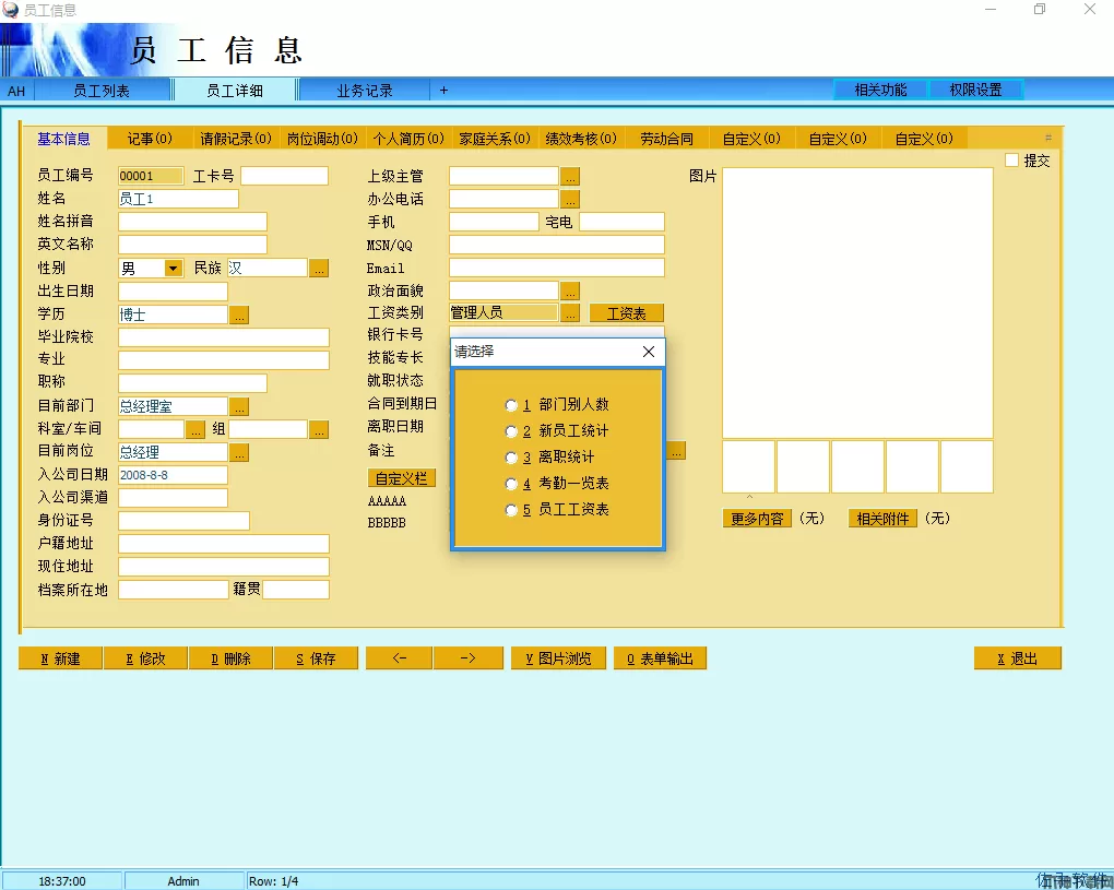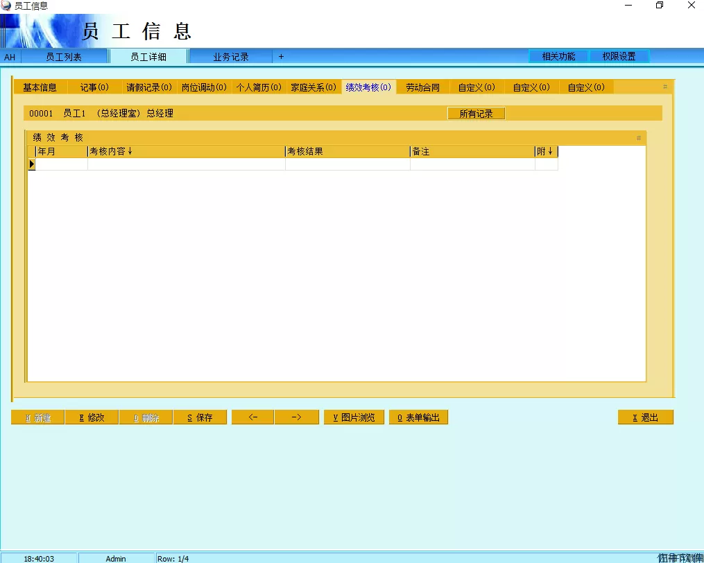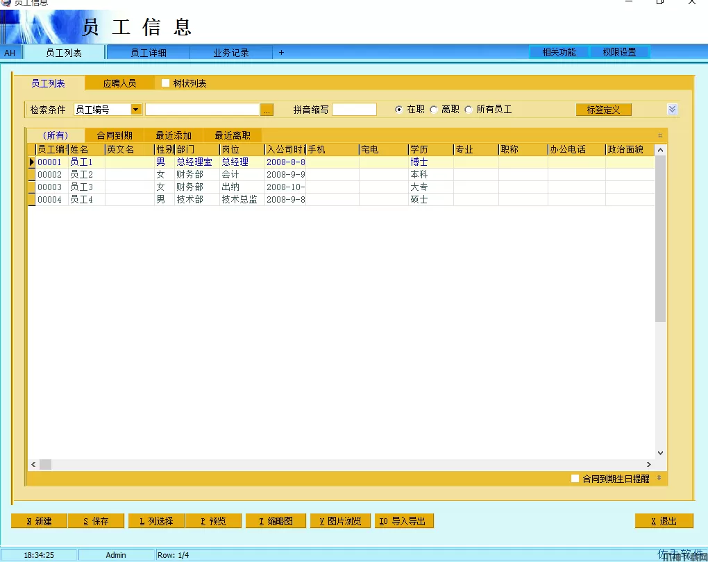 1、员工信息是人事管理模块的主程序,保存了所有在职离职员工的各种人事资料,可以通用权限设置来设定哪些用户可以查看和修改这些数据,权限设置里分基本信息和人事信息,如果没有人事信息查看权的话,则只能查看详细页面里的第一个页面。注意员工部门的输入是在岗位调动里添加一条新的调动记录,填入部门和岗位。
