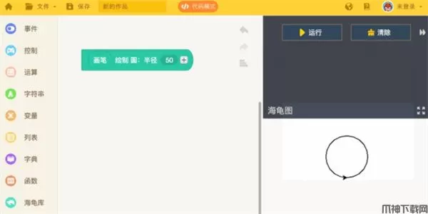 3、从海龟库积木盒拖出积木,点击“运行”,一键绘图。