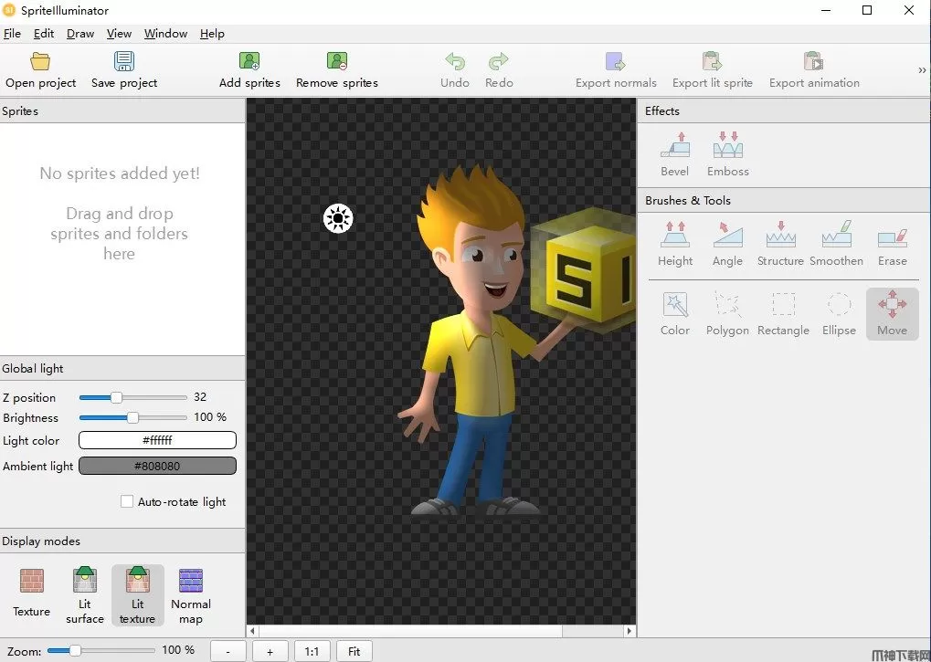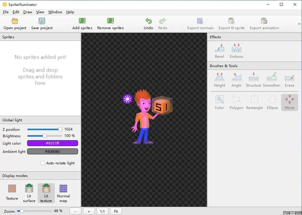 Spriteilluminator官方版是一款用于动态照明和特殊效果的法线贴图制作软件,由codeandweb官方推出,Spriteilluminator可以适用于Unity、Corona SDK和Phaser软件的辅助应用。Spriteilluminator最大的作用就是使得2D表面生成一定细节程度的光照方向和反射效果,使其相当于3d效果图,帮助用户节约精力和成本,提高用户满意度。用户能够使用Spriteilluminator根据精灵颜色的亮度添加高度差异,直接绘制法线贴图并微调效果,进入等距游戏的编辑模式。