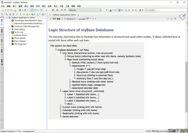 mybase Desktop官方版是一款非常专业的用于分类管理自由格式资料的数据库软件,用户可以在这里根据自己的需要自定义文件格式及层次关系。用户可以利用它轻轻松松的管理各式各样的信息,例如磁盘文件、资料、下载软件等,即使毫无规律的资料,在这里用户一样可以管理的井井有条。与传统意义上的数据库软件不同,myBase 7.0提供了更好的方式使知识/资料/信息的捕获、编辑、组织、查看、索引、搜索和分享变得更快捷、更容易,且无需任何SQL数据库编程技能;通过内置的富文本编辑器接受图文信息的输入,并按树形大纲分门别类保存,同时接受任意磁盘文件作为树形大纲条目的附件,可以方便建立条目关联、加贴内容标签、关联日历日期和添加超链接引用等。利用本软件可以方便快捷的构建出多层次、多维度、带交叉引用、支持快速查询、层次分明、一目了然的个人知识库,帮助自己将大量杂乱无章的碎片化知识点重新进行系统化的归纳整理和消化吸收,从而在大脑中建立完整的知识体系结构,保持思路清晰,有助于提升个人能力和学习/工作效率。