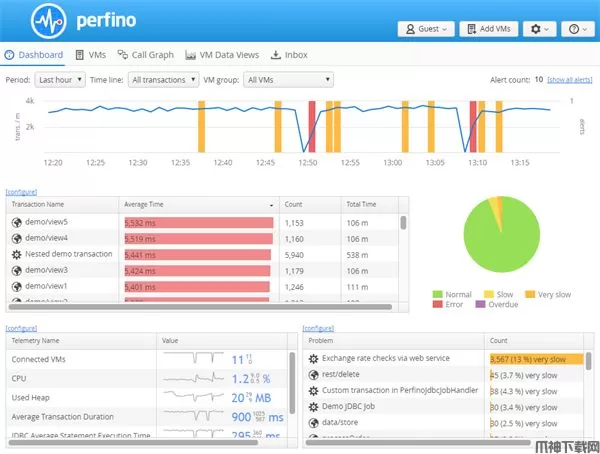 EJ Technologies Perfino,简称Perfino。这是一款功能强大的JVM监测工具,不仅对JVM进行侦测,为您提供监控多个java虚拟机之间的活动和相互作用的方式,还可以对业务事务进行记录。它的主要功能,是对JVM进行侦测,以及对业务事务进行记录,提供洞察他们的表现,以及他们的错误。Perfino的UI为其功能性做了优化,使得它不但能够用于及时trouble shooting,也能用于分析历史数据。通过设置不同的阈值,触发器和报警器,可以探测到JVM的异常。Perfino的最大特色,是它可以提供完整JVMTI级别的数据采样,并直接将采集的数据发送给JProfiler进行分析。Perfino最大特色,是它可以提供完整JVMTI级别的数据采样,并直接将采集的数据发送给JProfiler进行分析。Perfino的UI为其功能性做了优化,使得它不但能够用于及时trouble shooting,也能用于分析历史数据。通过设置不同的阈值,触发器和报警器,可以探测到JVM的异常。欢迎有需要的朋友下载使用!
