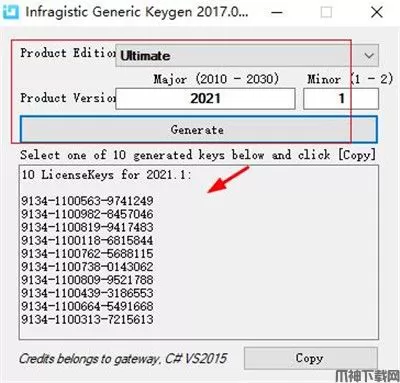 5、打开crack文件夹中的KgInfragistic.exe双击运行,选择对应的版本,点击Generate按钮生成激活码