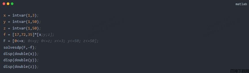 假设我们有一个简单的整数规划问题,要求最大化目标函数f = 17x + 72y + 35z,在满足限制条件0 <= x <= 3,0 <= y <= 50的情况下,找到最优的x,y,z。我们可以这样操作: