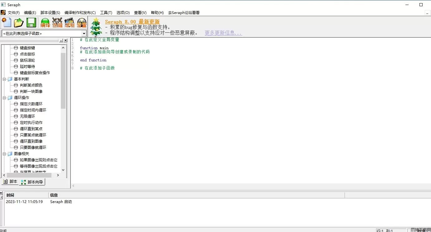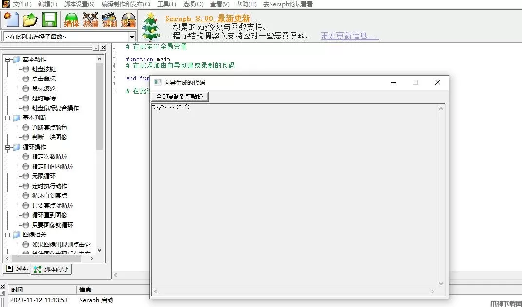 seraph脚本编辑器是一款行内顶尖的脚本控制软件,不知道大家接触过鼠标点击器没有,其中有一个功能就是脚本来实现的,而seraph脚本编辑器就是这样的一样脚本生成器,设置键盘上的任意一个按键,然后seraph脚本编辑器就会直接生产脚本代码,非常的使用且方便!而且集编辑器、代码编写器、程序运行器为一体,配有专用的图像捕捉、友好的功能向导和录制工具,强大的图像内存搜索引擎,完善的后台脚本支持,以及全面的第三方插件支持。功能空前的强大吗,而且seraph脚本编辑器实际操作非常的简单,易上手,也可以进行代码编写,非常的灵活。而且本站提供的这款seraph脚本编辑器是终身免费使用的,不用你花一分钱去注册。安全无毒,没有任何的恶意插件。有需要的朋友可以放心的下载使用!