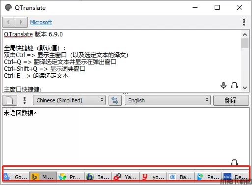 1、在软件内你可以看到最下方提供了9个翻译引擎供你自由切换,包含谷歌、微软、百度、有道、Deelp等,大家可以根据自身的使用习惯更好的选择。