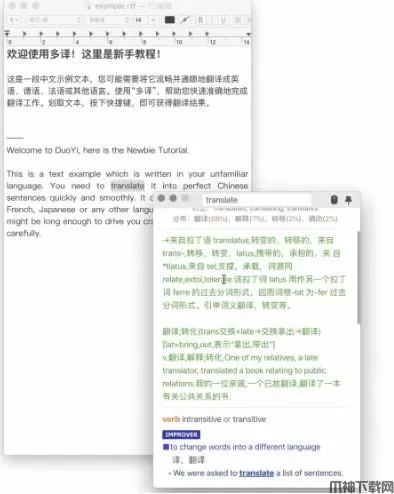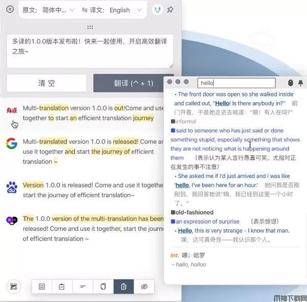2、毕竟像是翻译句子、复制翻译结果这样的功能才是翻译的生产力工具所必须的。另外我们其实往往还会通过比较不同词典里的不同含义,来确定哪一种更加合适。结合这样的思考,多译的雏形就诞生了——一款支持多源翻译的桌面端 App。
