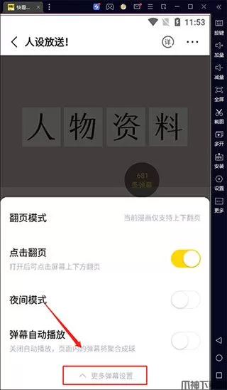3、在弹出的菜单界面,点击选择“更多弹幕设置”。