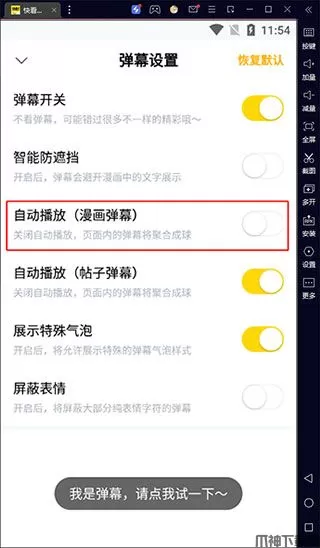 4、在弹幕设置界面,点击把“自动播放”右侧的开关打开,即可自动播放漫画弹幕。