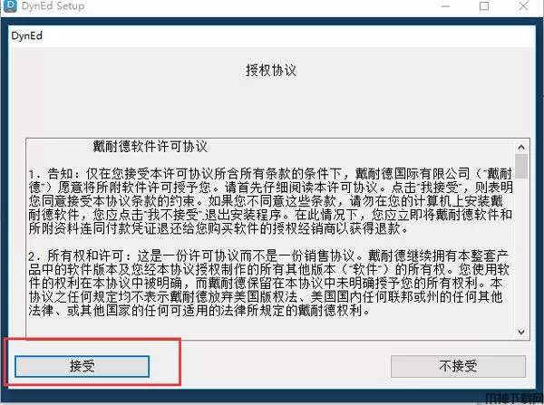 四、进行授权协议的查看,这里主要是告知用户在使用该程序需要遵守的法律和相关限制,同时提醒用户该程序的所有权归DynEd International公司,且不得用于商业行为等内容。用户详细浏览完成之后,点击“接受”