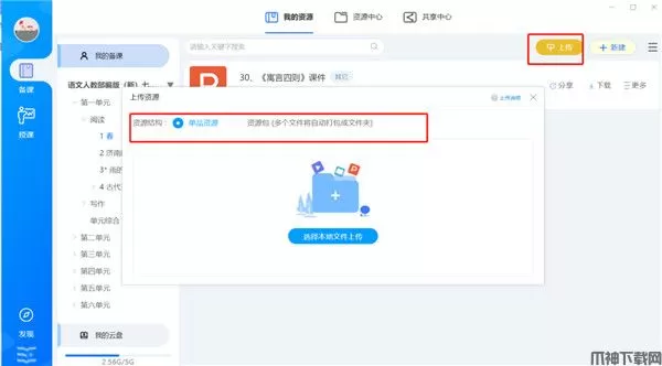 上传资源:点击右上方上传,可以上传单品资源或者资源包。如果想将某个章节相关的课件、教案等集中上传,推荐选择用资源包的方式进行上传,便于后续查看。