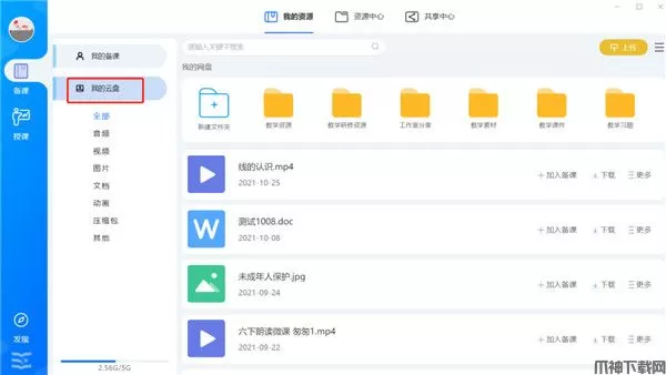 我的云盘显示用户上传资源及创建的文件夹。用户可对云盘的资源进行加入备课、下载、分享、重命名操作;对文件夹可进行重命名及删除。