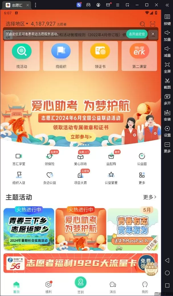 志愿汇电脑版是需要借助模拟器在电脑上运行的一款志愿公益活动软件,提供了志愿活动、行业交流、志愿保障以及志愿福利等全面性志愿服务,让志愿者们可以更轻松地报名参与公益事业,更有着安全、高效的志愿服务保障,让用户可以安全、放心的顺利参与志愿活动。