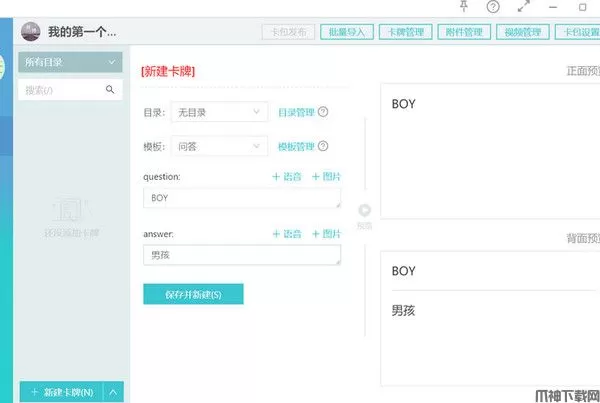 卡片的模板类型总共有4个,我们这里选择基础卡牌;并分别在question处填写上:BOY, 在answer处填写上:男孩; 我们在右边就会发现产生一个学习卡片,正面是:BOY,反面是对应的答案:男孩。
