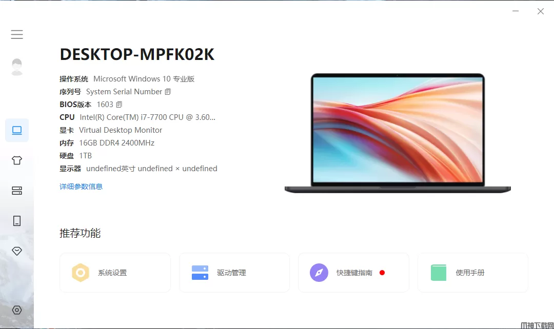 1、打开小米电脑助手,映入眼帘的是电脑的参数界面,电脑的具体参数配置就会显示在第一面,更加的直观的看清楚电脑的配置;