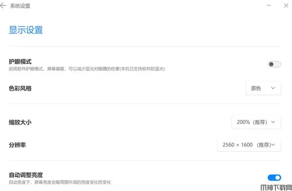 2、点击此界面系统设置,会打开显示设置,在这个界面,用户可以在此界面开启护眼模式,调整一些显示的功能,刷新率等;