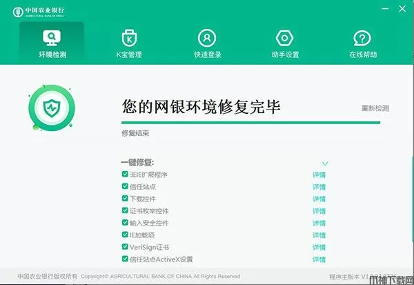 3)设置完毕后,网银助手将进行“全面检测”,您可对检测发现的问题进行“一键修复”。