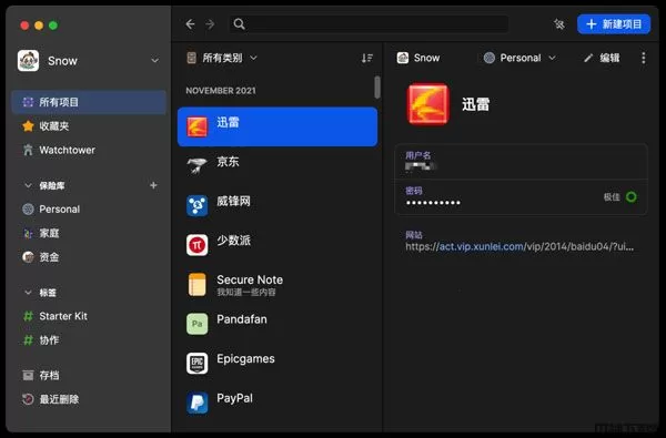深浅双色外观的加入,这也算是目前应用的「标配」,你可以在「首选项 - 通用」中选择不同配色,或是跟随系统设定。1Password 作为一款工具应用,时不时需要被调起,深色模式可以降低弱光环境下双眼受到的刺激,也在一定程度上提升了应用的美感。