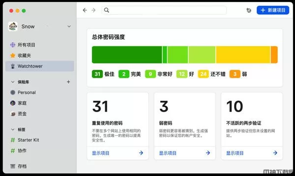 解锁后的主界面依旧保留了三栏设计,最左侧是分类目录和管理项,第二栏是项目清单,第三栏则是具体的项目数据和功能服务。相较于此前布局更宽松,清扫了一些划分空间的线条,还加入各种彩色小图标,尤其是「新建项目」蓝色按钮放在应用右上角,相较之前版本鲜明不少。