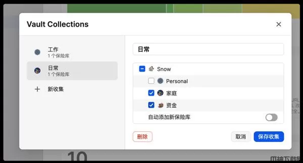 点击「头像 - 管理收集(Collections)」,你就可以配置适用于不同场景下的保险库了。相比于之前仅靠保险库区分类别,收集上升了一个层级,配置自由度更大,也无需使用复制项目来满足不同场景使用同一项目的需要,进一步提升不同场景化下的效率需求。