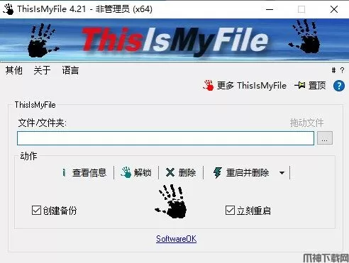 ThisIsMyFile(文件解锁工具)官方版是非常好用的小型有效的文件解锁工具,显示锁定或受保护文件的应用程序,只需点击几下即可解锁它们。多种方式来添加目标文件或文件夹由于简单的布局和简单的选项,,专用于解决文件无法打开、复制、剪切、移动、删除的问题,支持在解锁前备份,可以有效的避免解锁造成的文件损坏。该款软件可以用于解锁和/或删除锁定或受保护的文件。有的时候删除文件会提示文件是由另一个人或程序使用不能删除,而且那些被病毒控制不能正常删除的文件这个软件都能删除,这款小工具可以强制关闭相关文件或服务然后将其删除,非常实用。ThisIsMyFile是一款非常实用、非常便捷、非常受欢迎、且软件小巧、绿色免费的保护锁定文件工具软件,只需几个步骤就可以吧那些受保护或锁定的文件轻松删除。欢迎有兴趣的朋友前来下载使用!