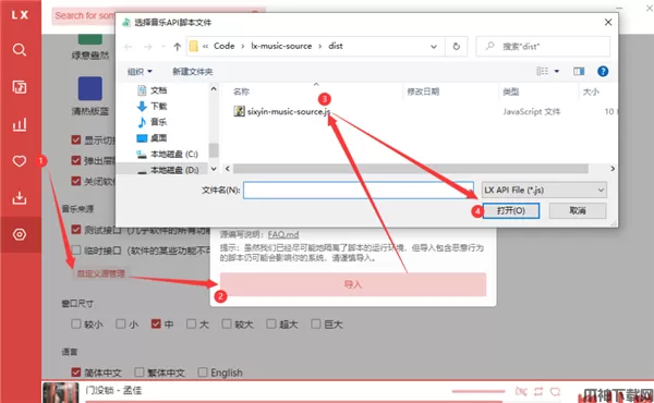 2、打开洛雪音乐助手的设置,找到音乐来源,点击自定义源管理,然后点击导入,选择之前下载后解压出来的sixyin-music-resource.js文件