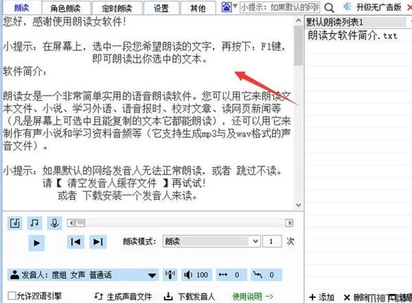3、打开之后就可以在朗读女的界面中看到文档内容了;