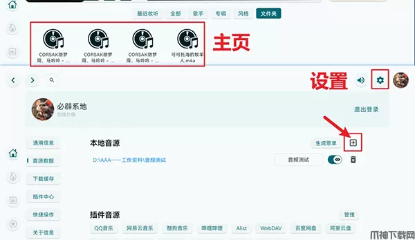 2、在右上角的设置里,打开音源数据,你可以通过旁边的“+”图标添加本地音乐文件,添加完后,主页里就会显示本地音乐了。