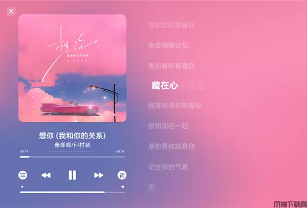 3、音乐播放界面也很精美,看起来就很舒适,歌词、封面等基础功能都有。