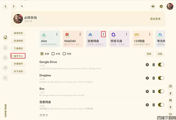 1、在设置中选择“插件中心”按钮,点击网盘右上角的纵向三点标记。
