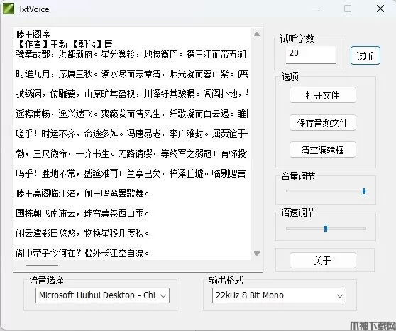 Txtvoice是一款专业的txt语音小说转换器。Txtvoice功能强大,操作简单,界面简洁,方便快捷实用。它可以将txt转化成音频文件,相当于自动生成语音小说,而且它也会检查你Windows系统自带的语音库。而且,Txtvoice软件最大的特点就是可以将txt文本转换为wav音频文件,存入mp3播放,作为有声小说,听书使用。值得注意的是,如果选的语音是英文语音(English),它只能读英文,如果选择汉语语音(Chinese)一般能读汉语和英语。除此之外,Txtvoice绿色版十分的实用方便,操作简单又快捷,有需求的小伙伴们可在此点击下载!