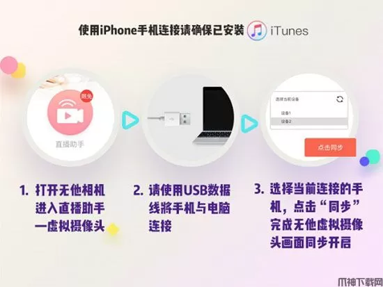 四、无他伴侣是需要与手机APP无他相机的【直播助手】连接才可使用,因此你需要准备一根数据线将手机与电脑连接(Android系统与iOS系统皆可下载【无他相机App】,暂不支持WiFi环境下连接,由于无线网络不稳定,带宽有限,会造成画面延迟);