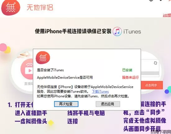 二、确保电脑中已成功安装了无他伴侣客户端;若你使用的是iPhone,要确保将连接的电脑上已经安装了iTunes,才能正常使用无他伴侣。 (为保证itunes版本有效,请一定在无他伴侣的提示中点击下载并不要更新,使用无他伴侣过程中不需要打开iTunes,安装了即可);
